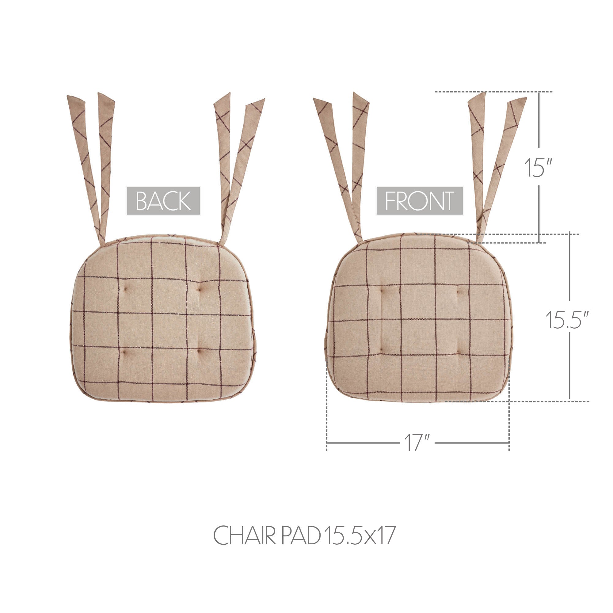 Elevate your seating experience with the VHC Brands Chair Pad from the Connell Collection. Measuring 15.5x17 inches, this chair pad brings a touch of primitive and country charm to your dining or living room chairs. The tucked design adds texture and character to your seating arrangement, making it a perfect addition to farmhouse-style or indoor rocking chairs. Crafted with a firm and comfortable filling, this chair cushion provides a cozy and supportive seat. The chair pad is equipped with ties, ensuring it stays securely in place while you dine or relax. Its burgundy color palette with a classic windowpane check pattern in black and white adds a timeless appeal to your space. Not only does this chair pad enhance your seating decor, but it also offers comfort and durability. The Connell Collection Chair Pad is designed to withstand everyday use, making it a practical and stylish addition to your home. Upgrade your dining or living room chairs with this versatile accessory, blending primitive and country elements effortlessly while providing a firm and inviting seat for you and your guests.