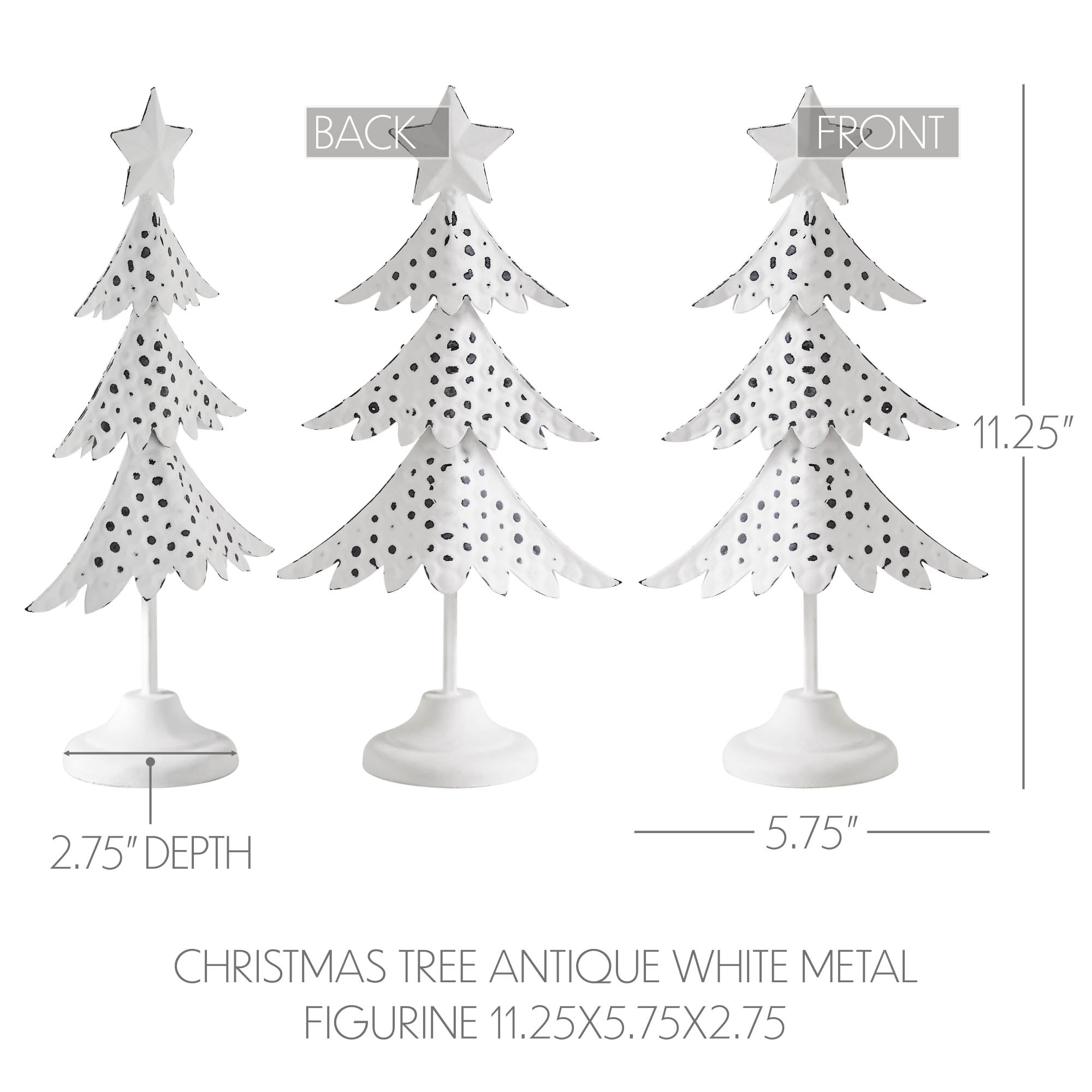 Enhance the ambiance of your winter and Christmas decor with the timeless elegance of the VHC Brands Metal Christmas Tree Antique White Figurine. Standing at 11.25 inches tall, this charming metal figurine embodies the spirit of the holiday season with its classic design and rustic allure. Crafted from sturdy metal, this figurine features a delightful Christmas tree silhouette complete with intricate details and a star topper, adding a touch of festive whimsy to any tabletop or shelf. The antique white finish exudes a vintage-inspired charm that complements a variety of decor styles, from traditional to rustic. Its primitive and rustic aesthetic enhances its cozy appeal, making it a versatile accent piece for your dining room, entryway, or living room decor. Whether displayed on its own or paired with other holiday decorations, this figurine brings a sense of nostalgia and warmth to your home during the winter months and Christmas festivities. Maintaining the pristine appearance of this metal Christmas tree is effortless - simply wipe it clean with a soft cloth as needed to keep it looking its best throughout the holiday season. With its enduring charm and distressed appearance, the VHC Brands Metal Christmas Tree Antique White Figurine adds a touch of vintage-inspired beauty and holiday cheer to your indoor decor, making it a cherished part of your winter and Christmas celebrations for years to come.